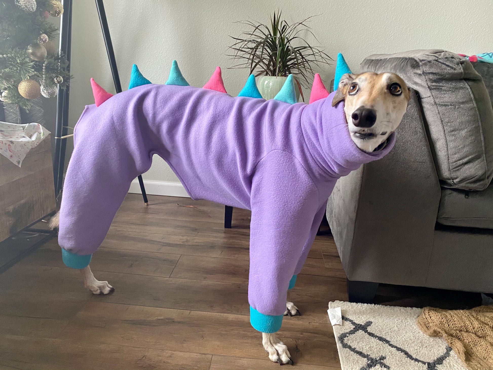 All pajamas are made to order, so colors are super customizable. Not feeling a purple dinosaur? That’s okay! Select the colors you’d like our dinosaur to be and we’ll make a pair that works for your houndie! Have colors outside of what's available in mind? Reach out and we'll let you know what's possible.